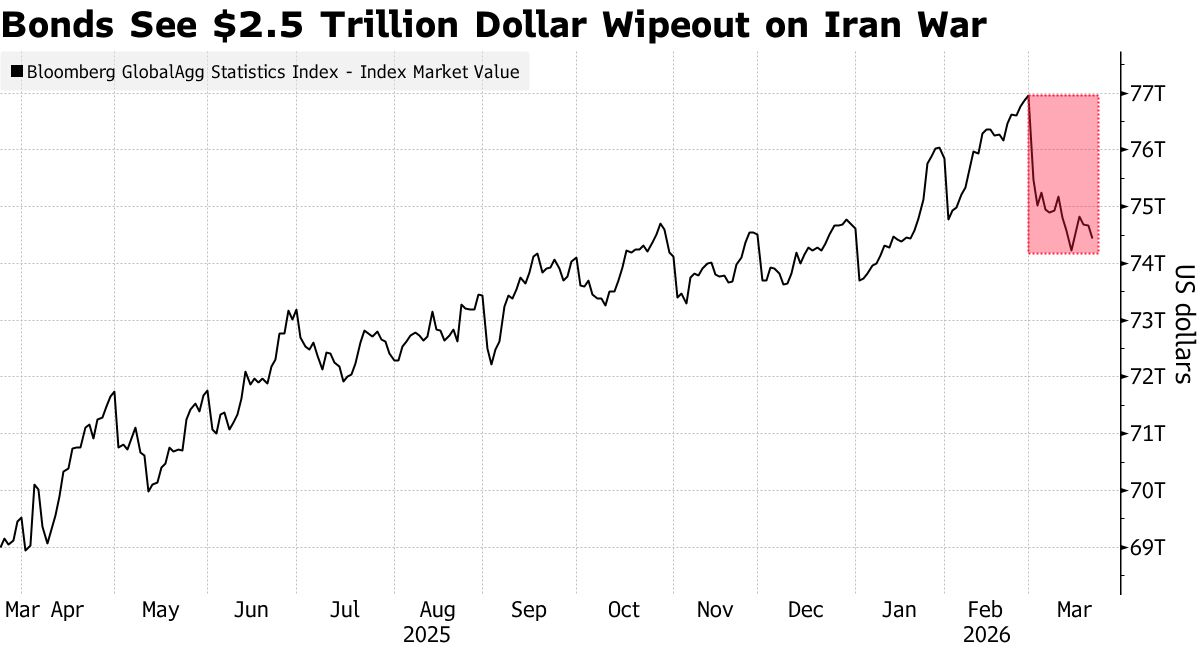 وحسب بيانات وكالة (بلومبيرغ) اليوم الاثنين، انخفض إجمالي القيمة السوقية لديون الحكومات والشركات والأوراق المالية المدعومة بالأصول إلى 74.4 تريليون دولار، مقارنةً بنحو 77 تريليون دولار في نهاية شباط، ما يضع السوق على مسار تسجيل أكبر انخفاض منذ أيلول 2022، عندما كان بنك الاحتياطي الفيدرالي الأميركي في خضم دورة تشديد السياسة النقدية عبر رفع أسعار الفائدة. ومن حيث النسبة المئوية، فقد تراجع المؤشر 3.1 بالمئة هذا الشهر.