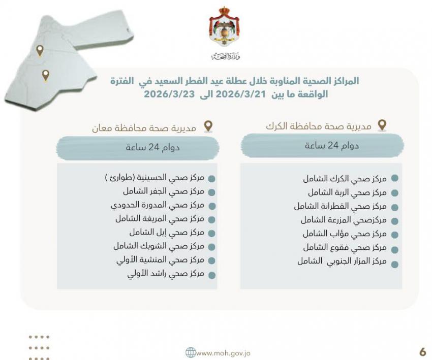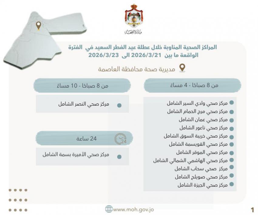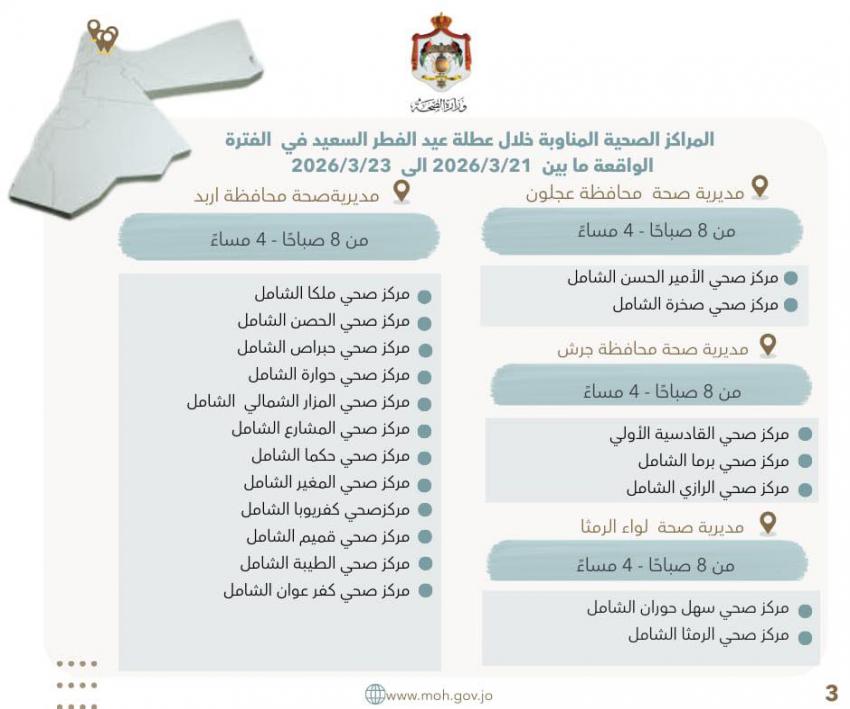 أردني – أعلنت وزارة الصحة عن خطة دوام المراكز الصحية التابعة لها خلال عطلة عيد الفطر السعيد، وذلك لضمان استمرارية تقديم الخدمات الطبية والرعاية الصحية للمواطنين في جميع محافظات المملكة.