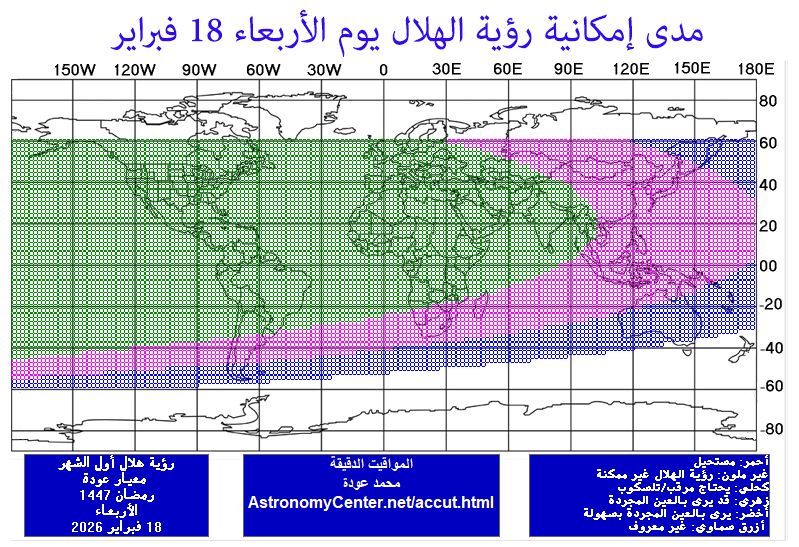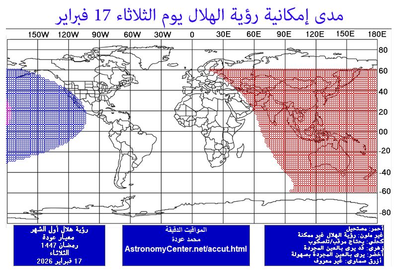 وتبين الخرائط التالية من معيار عودة، مدى إمكانية رؤية هلال شهر رمضان يومي الثلاثاء 17 شباط والأربعاء 18 شباط من جميع مناطق العالم، بحيث أن رؤية الهلال مستحيلة من المناطق الواقعة في اللون الأحمر بسبب غروب القمر قبل غروب الشمس أو/و بسبب حصول الاقتران السطحي بعد غروب الشمس.