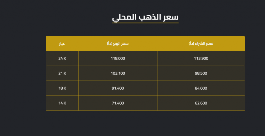 وبلغ سعر بيع غرام الذهب عيار 21 في السوق المحلية، ، 103.1 دنانير لغايات البيع من محالّ الصاغة، مقابل 98.5 دينارا للشراء.