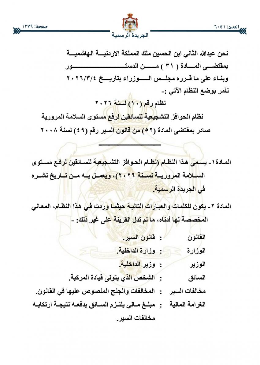 أردني – دخل نظام الحوافز التشجيعية للسائقين لرفع مستوى السلامة المرورية الصادر بمقتضى المادة (٥٢) من قانون السير رقم (٤٩) لسنة ٢٠٠٨، حيز التنفيذ، بعد نشره في الجريدة الرسمية اليوم الخميس.
