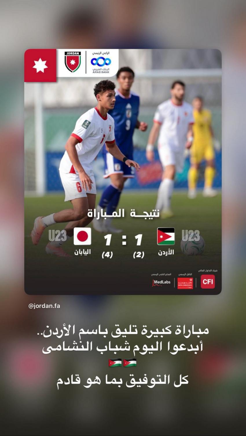 أردني – أشاد سمو الأمير الحسين بن عبدالله الثاني بأداء المنتخب الوطني تحت سن 23 خلال مباراتهم في ربع نهائي كأس آسيا المقامة في السعودية، والتي انتهت بفوز المنتخب الياباني بركلات الترجيح.