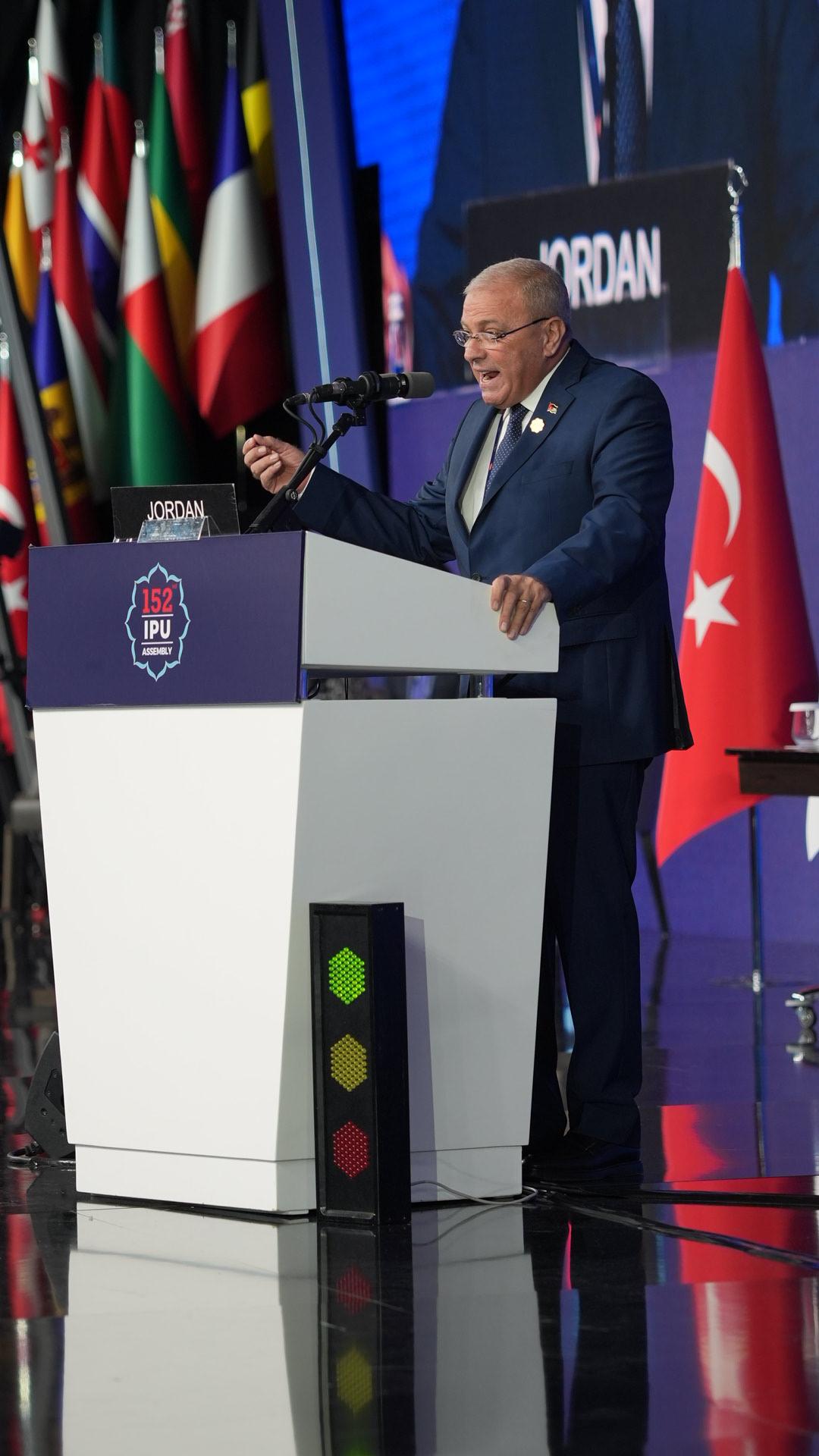 حديث عطية جاء ذلك خلال إلقائه كلمة الوفد الأردني في أعمال الاجتماع الـ152 للجمعية العامة للاتحاد البرلماني الدولي، المنعقد في مدينة إسطنبول التركية، والتي شدد خلالها على أن العالم يمر بمرحلة مفصلية تتشابك فيها الأزمات السياسية والاقتصادية والإنسانية، ما يفرض على البرلمانات دورًا مضاعفًا في حماية القيم الدولية، وفي مقدمتها العدالة وحقوق الإنسان وسيادة القانون.