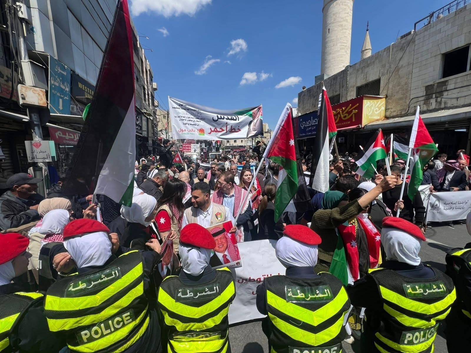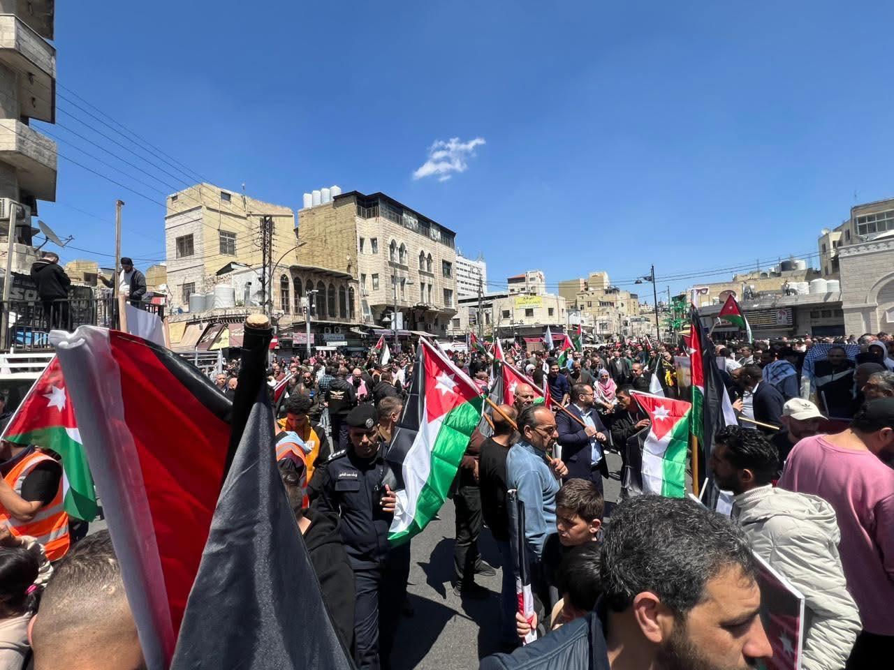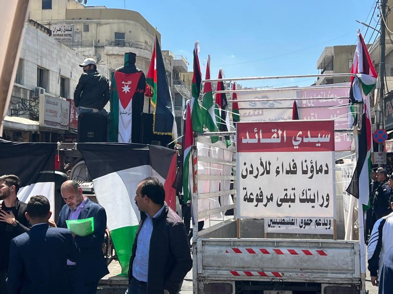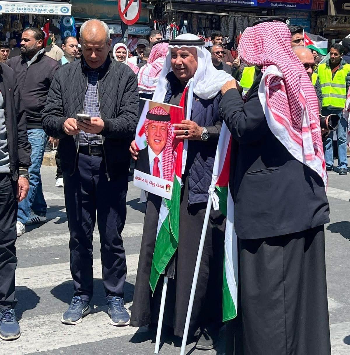 ورفع المشاركون الأعلام الأردنية والفلسطينية، مرددين هتافات تؤكد دعمهم للقيادة الهاشمية ومواقفها الداعمة لحقوق الشعب الفلسطيني، وعلى رأسها إقامة دولته المستقلة على ترابه الوطني.