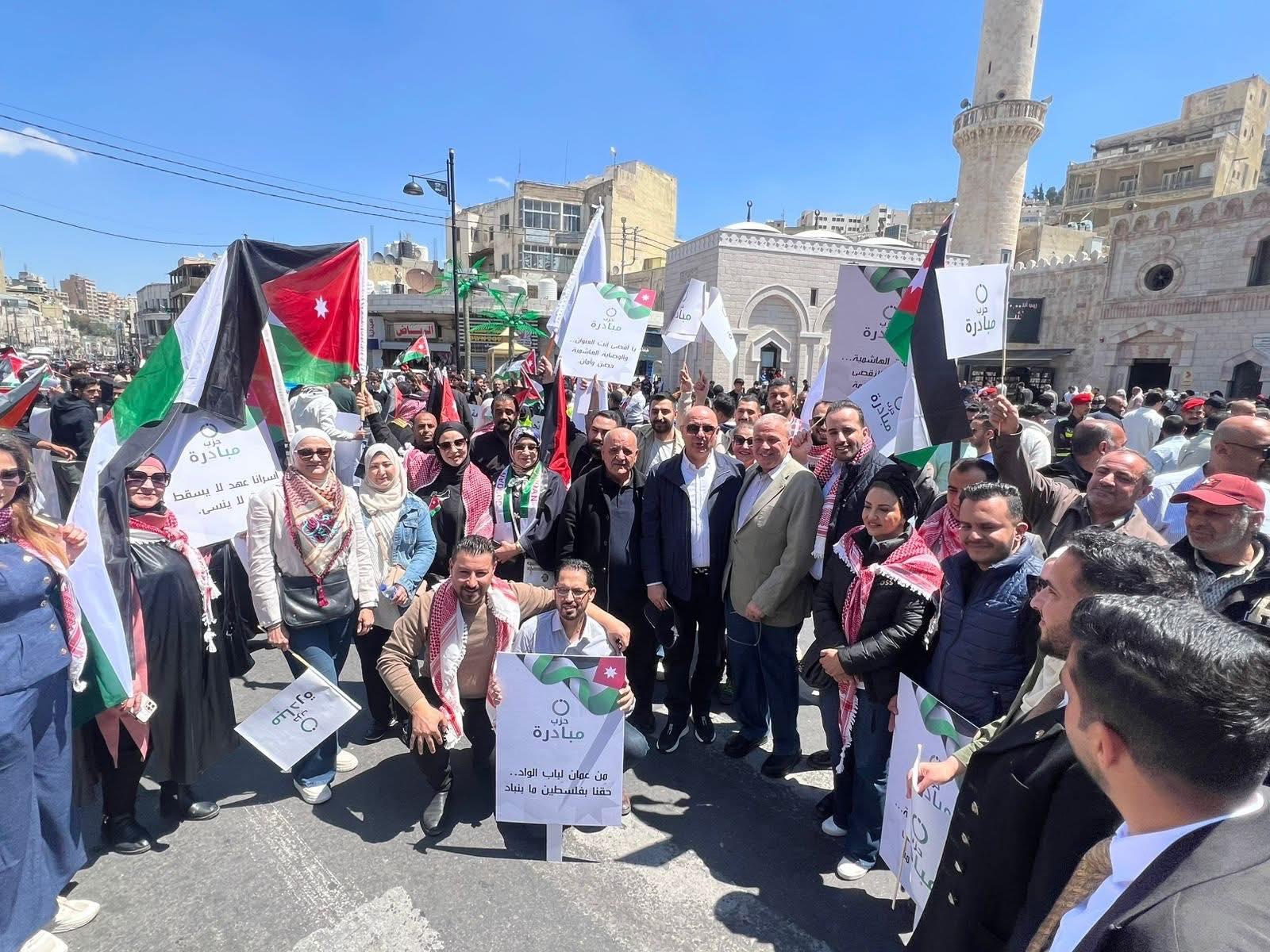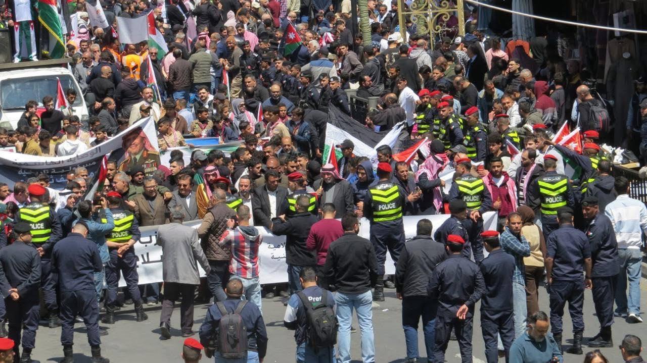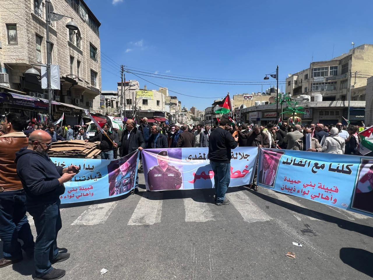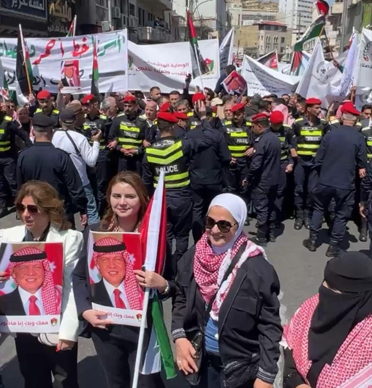 ورفع المشاركون الأعلام الأردنية والفلسطينية، مرددين هتافات تؤكد دعمهم للقيادة الهاشمية ومواقفها الداعمة لحقوق الشعب الفلسطيني، وعلى رأسها إقامة دولته المستقلة على ترابه الوطني.