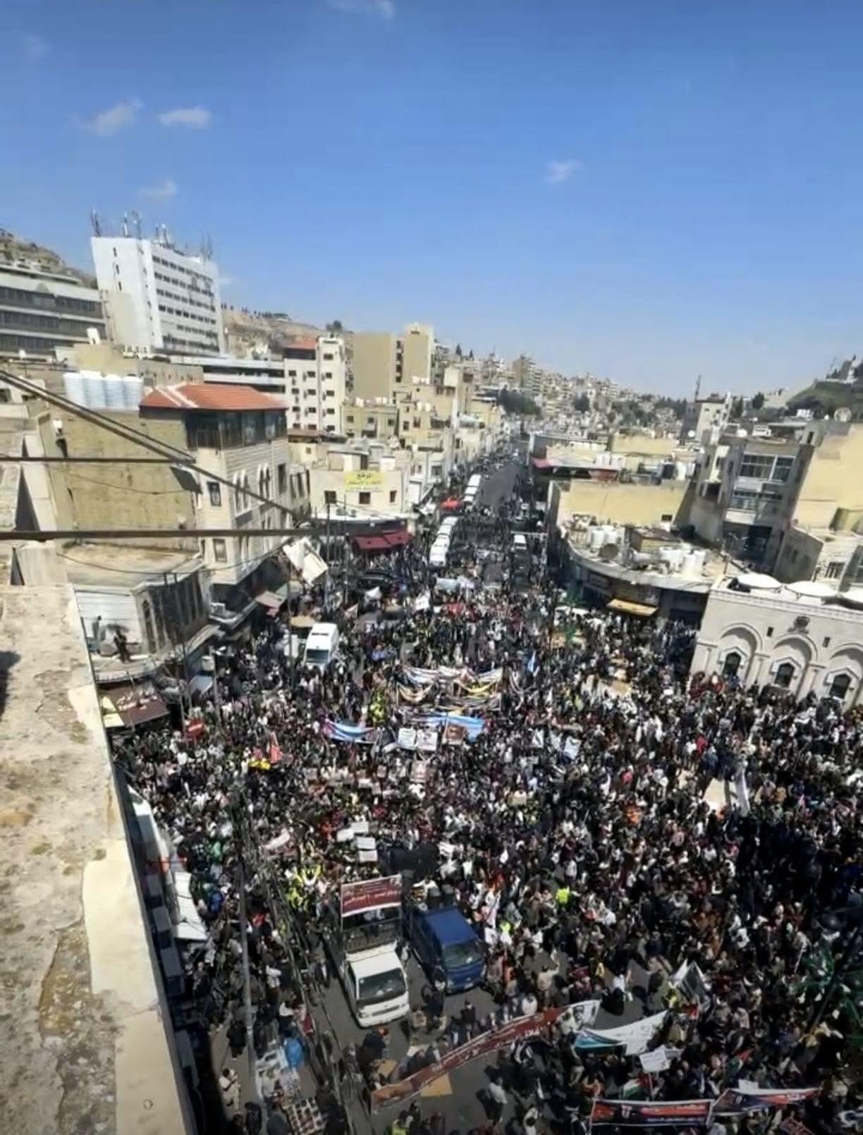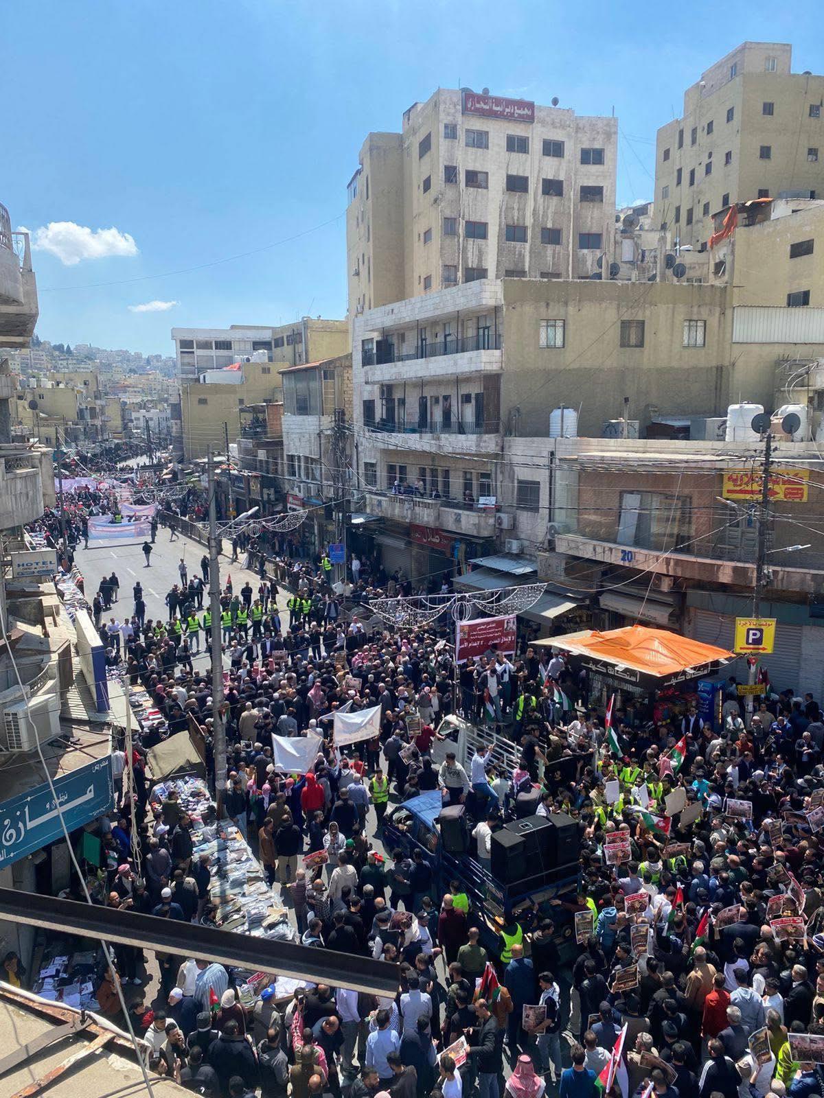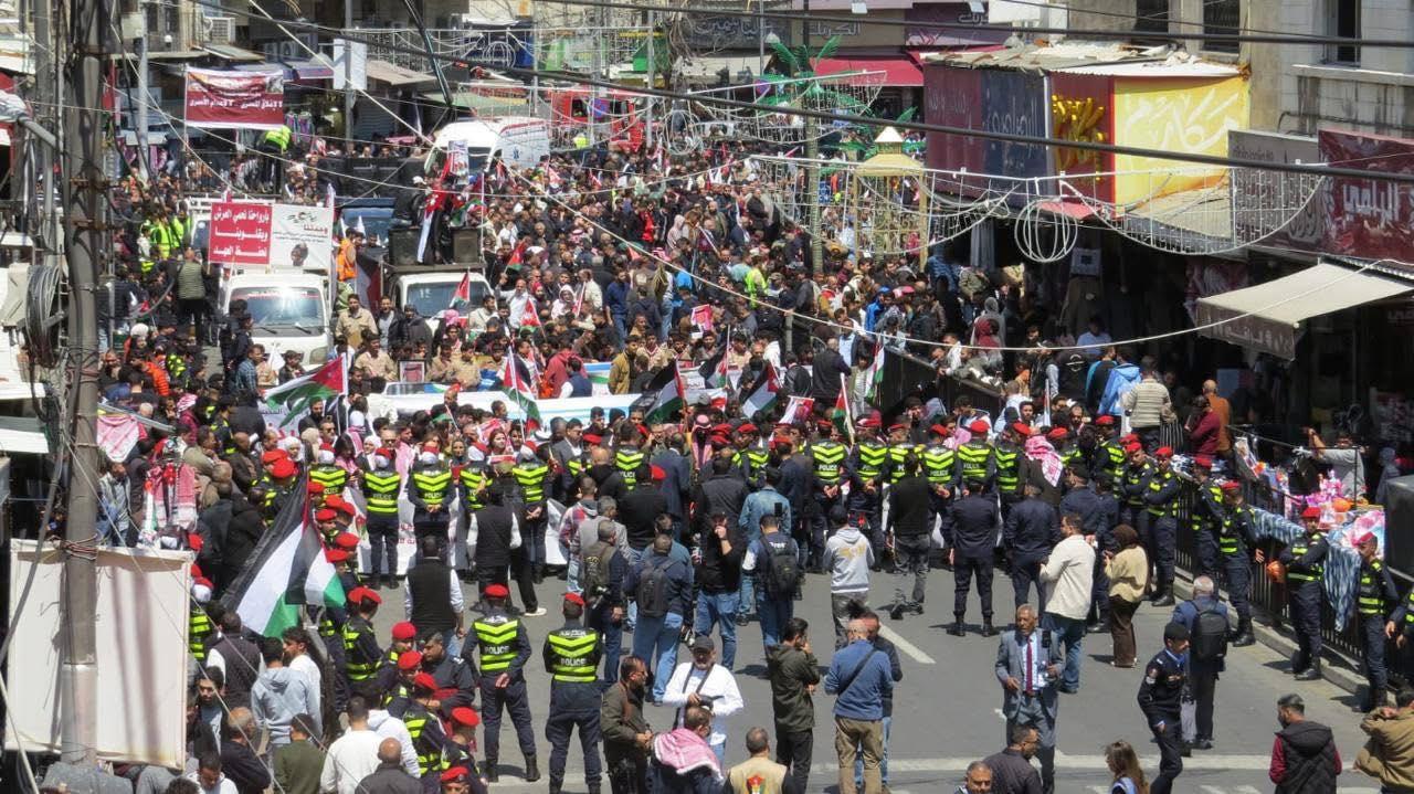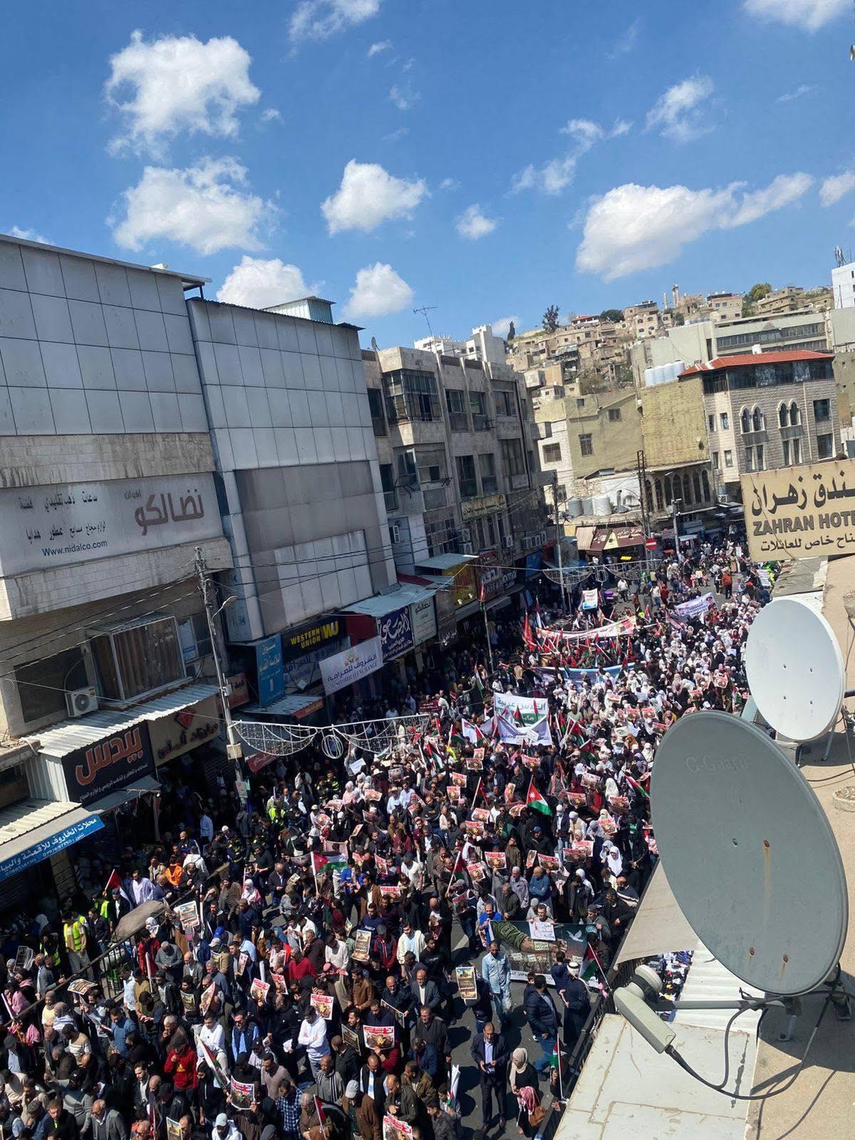 أردني – شهدت منطقة وسط البلد في العاصمة عمّان، اليوم الجمعة، خروج مسيرة شعبية وحزبية ونقابية حاشدة، عبّر المشاركون فيها عن تأييدهم للمواقف الملكية الثابتة تجاه القضية الفلسطينية، ورفضهم لإعدام الأسرى.