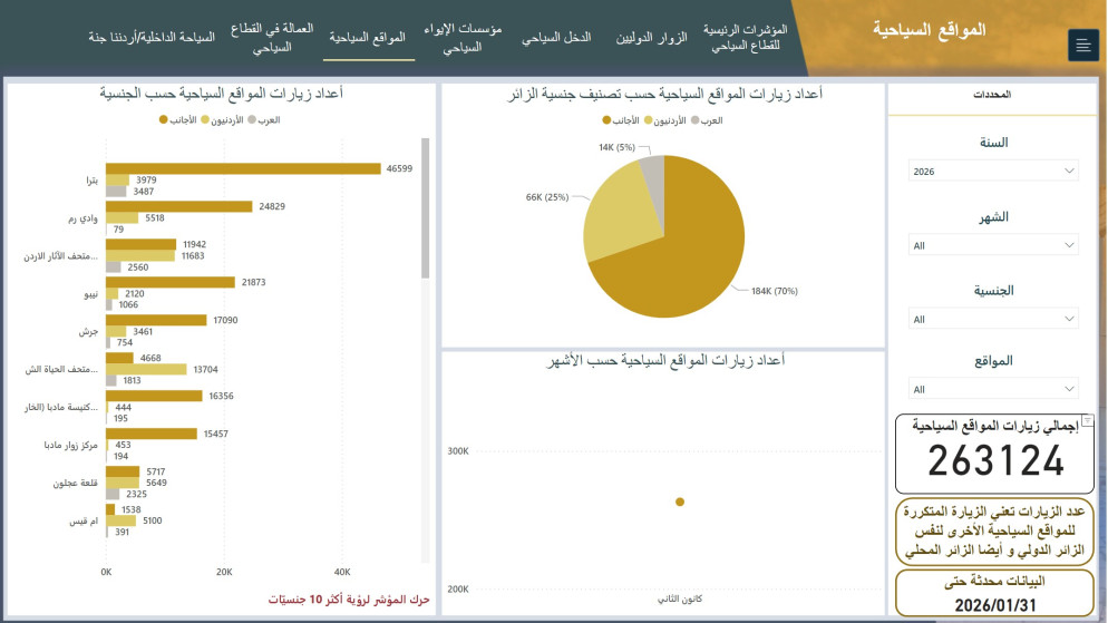 ووفقًا للبيانات، فإن الزوار الأجانب احتلوا نسبة 70% من إجمالي عدد الزيارات، والأردنيين 25%، بينما العرب 5%..