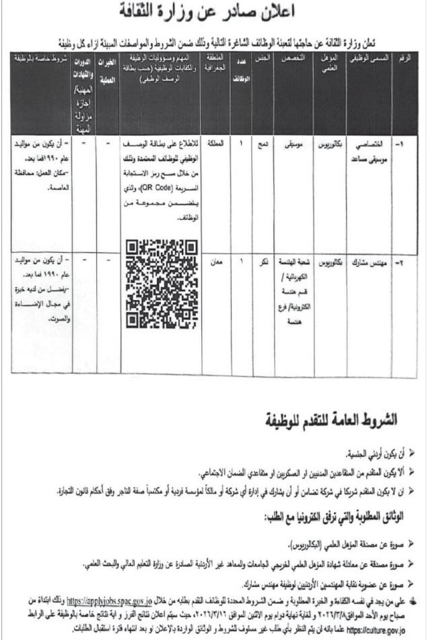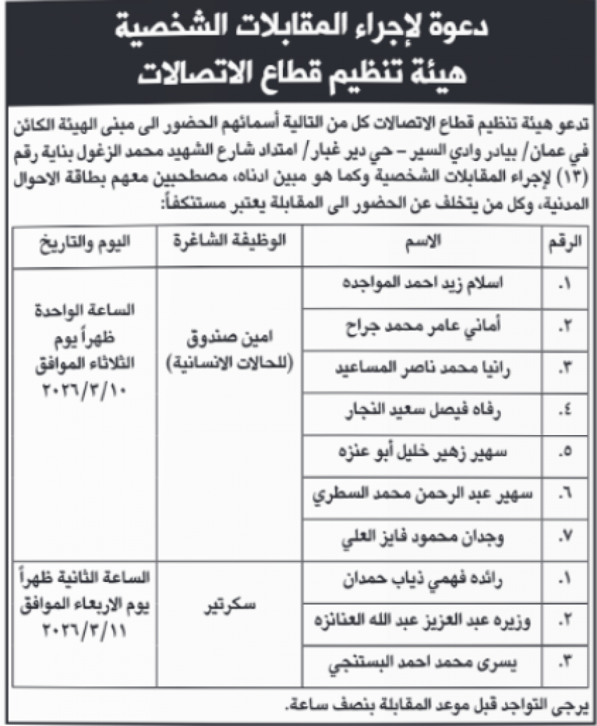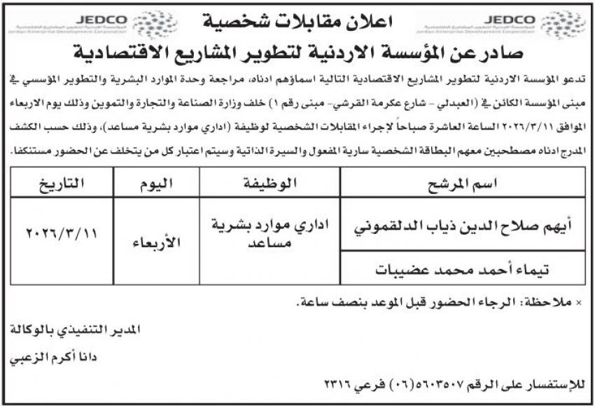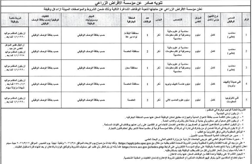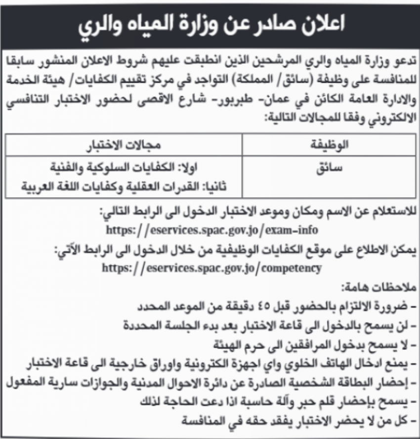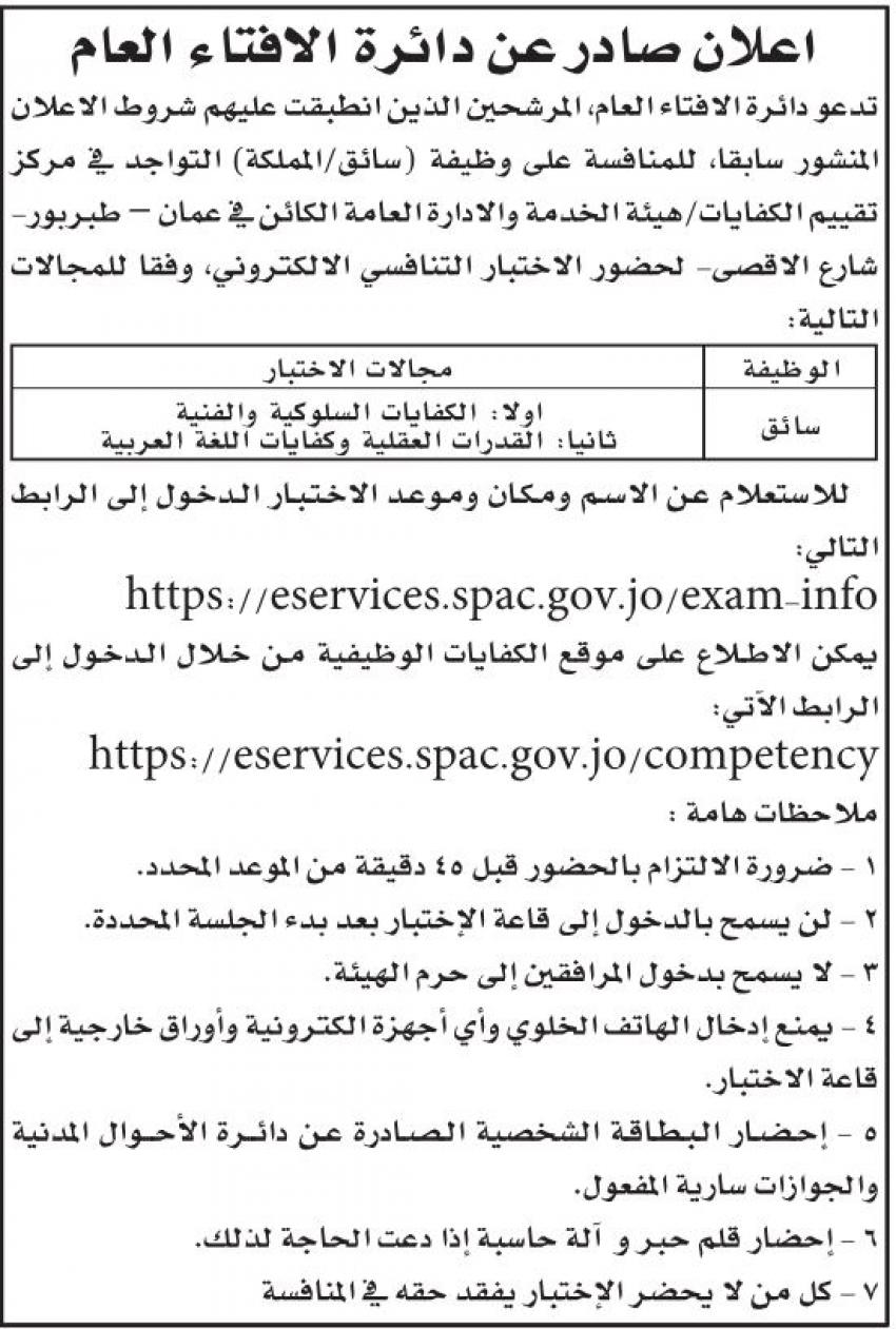 أردني – أعلنت مؤسسات حكومية اليوم الاربعاء، عن توفر وظائف شاغرة لديها، فيما أعلنت اخرى عن دعوتها اشخاص لاجراء الامتحان التنافسي، واجراء المقابلات الشخصية لغايات التعيين.