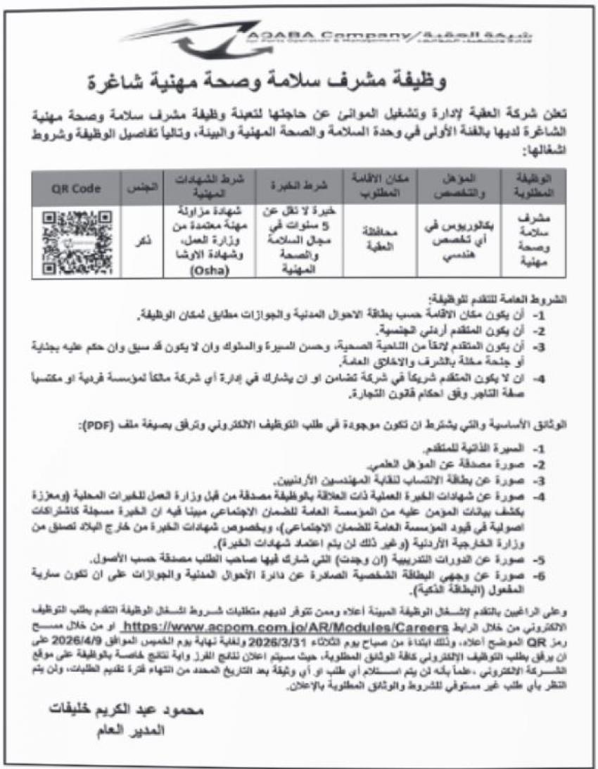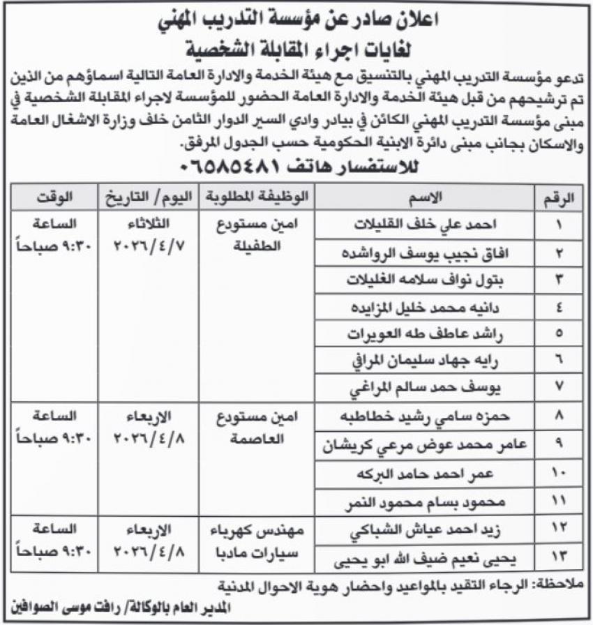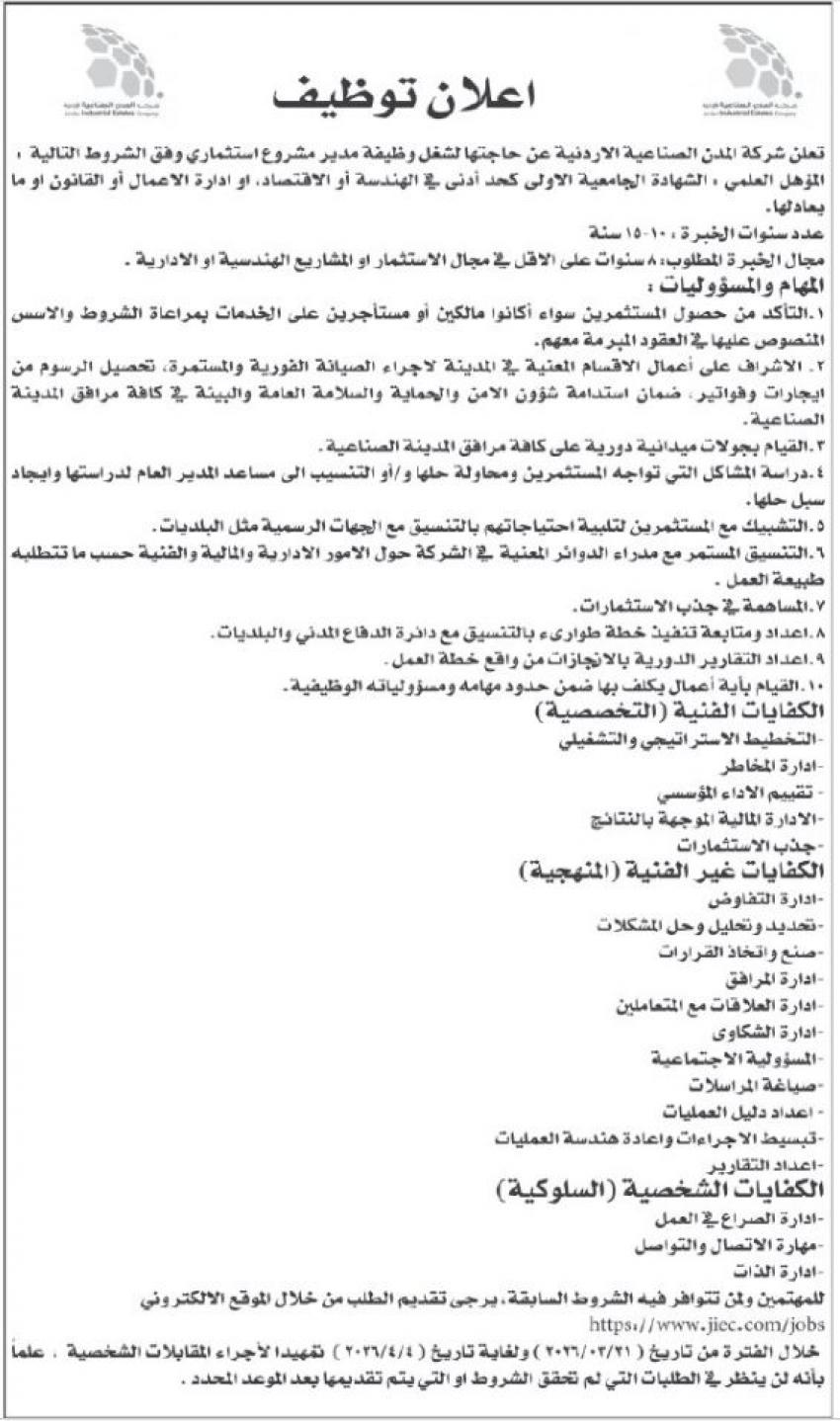 أردني – أعلنت شركات ومؤسسات حكومية اليوم الثلاثاء، عن حاجتها لتعبئة شواغر وظيفية، فيما أعلنت اخرى دعوتها للمقابلات الشخصية.
