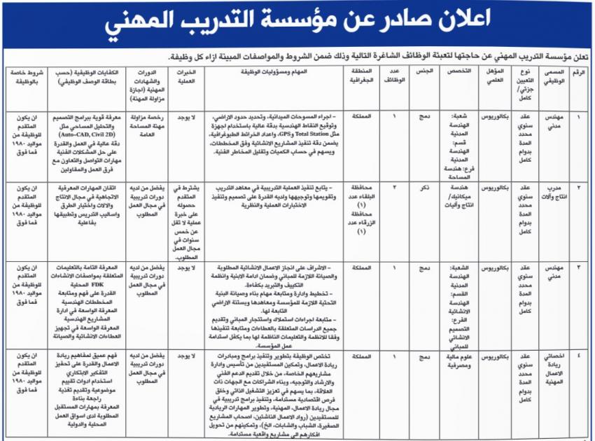 أردني - أعلنت وزارات ومؤسسات حكومية اليوم الأحد، عن حاجتها لتعبئة وظائف شاغرة. وتاليا التفاصيل: