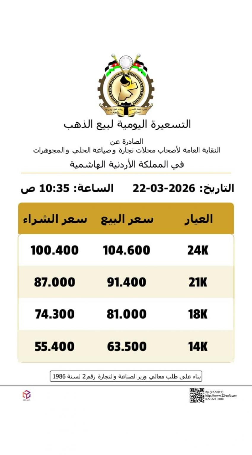 وبلغ سعر الغرام الواحد من الذهب عيارات 24 و18 و14 لغايات البيع من محلات الصاغة عند 104.6 دينارا و81 دينارا و63.5 دينارا على التوالي.